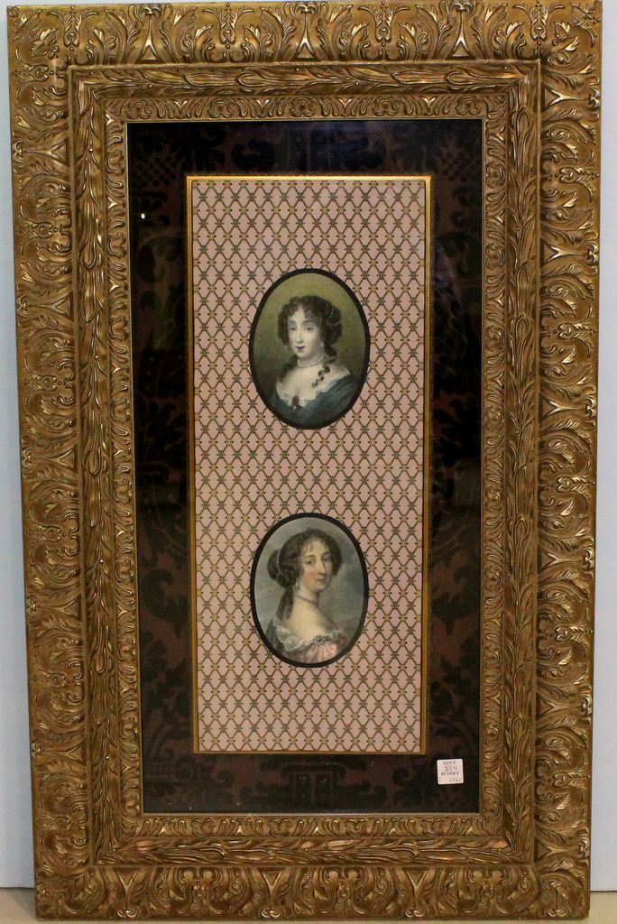 Two beautiful French lady prints in elaborately carved frames.; 22 1/2" w., 36" h. Two beautiful French lady prints in elaborately carved frames.; 22 1/2" w., 36" h.