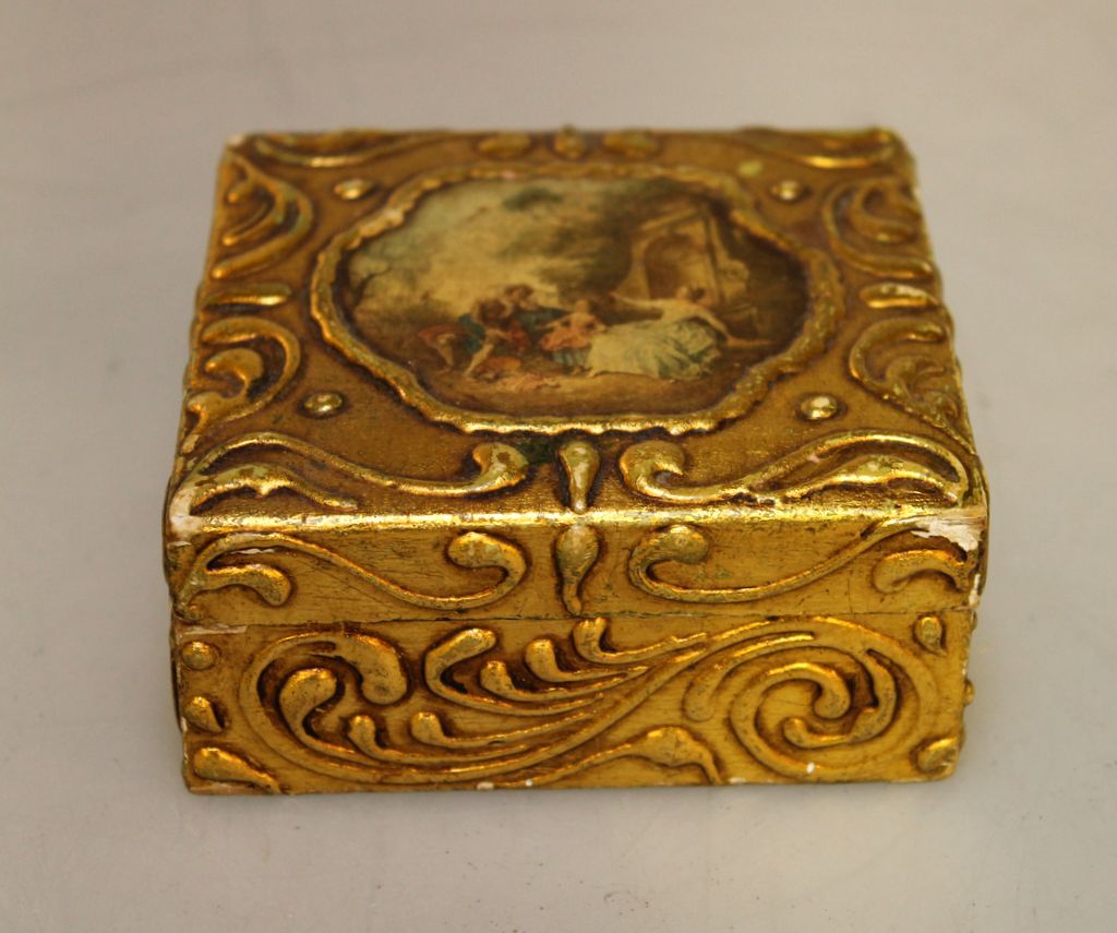 Florentine box with courtship scene.; 4" square Florentine box with courtship scene.; 4" square