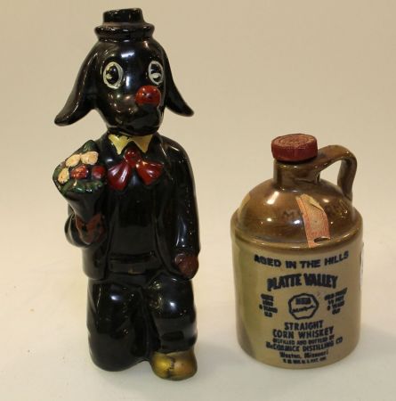 Ceramic dog holding flowers decanter, 7" h.; Platte Valley Small Jug, 5 1/2" h. Ceramic dog holding flowers decanter, 7" h.; Platte Valley Small Jug, 5 1/2" h.