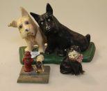 Small iron figure of cat, 3" h.; Iron figure of dog at fire hydrant, 2 1/2" square; Scottie dog doorstop, 8" w., 5 1/2" h. Small iron figure of cat, 3" h.; Iron figure of dog at fire hydrant, 2 1/2" square; Scottie dog doorstop, 8" w., 5 1/2" h.