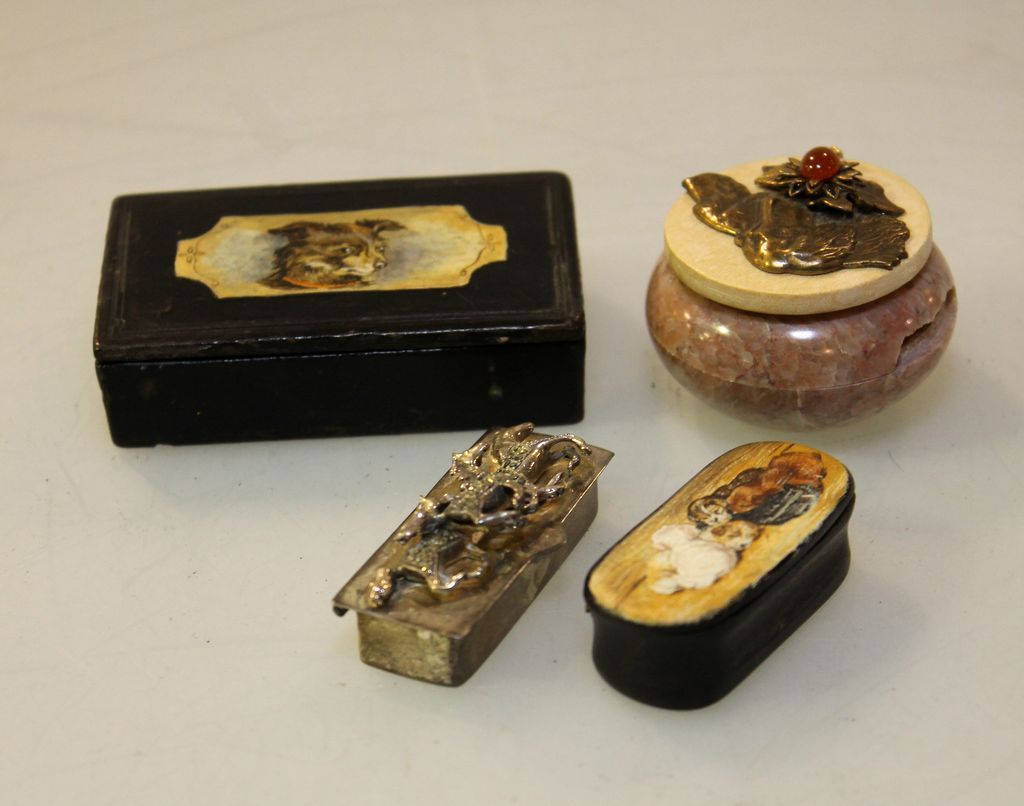 Victorian dog snuff box, 3" w., 2" d., 1 1/2" h.; Small 2" hand painted box of dogs; Small silverplate 2 1/2" w. box with horses; Broken marble jar, 1 1/2" dia. Victorian dog snuff box, 3" w., 2" d., 1 1/2" h.; Small 2" hand painted box of dogs; Small silverplate 2 1/2" w. box with horses; Broken marble jar, 1 1/2" dia.