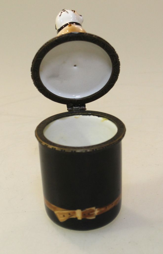 Bombay Company porcelain box with lift top of dog.; 2 1/2" dia., 5" h. Bombay Company porcelain box with lift top of dog.; 2 1/2" dia., 5" h.