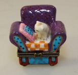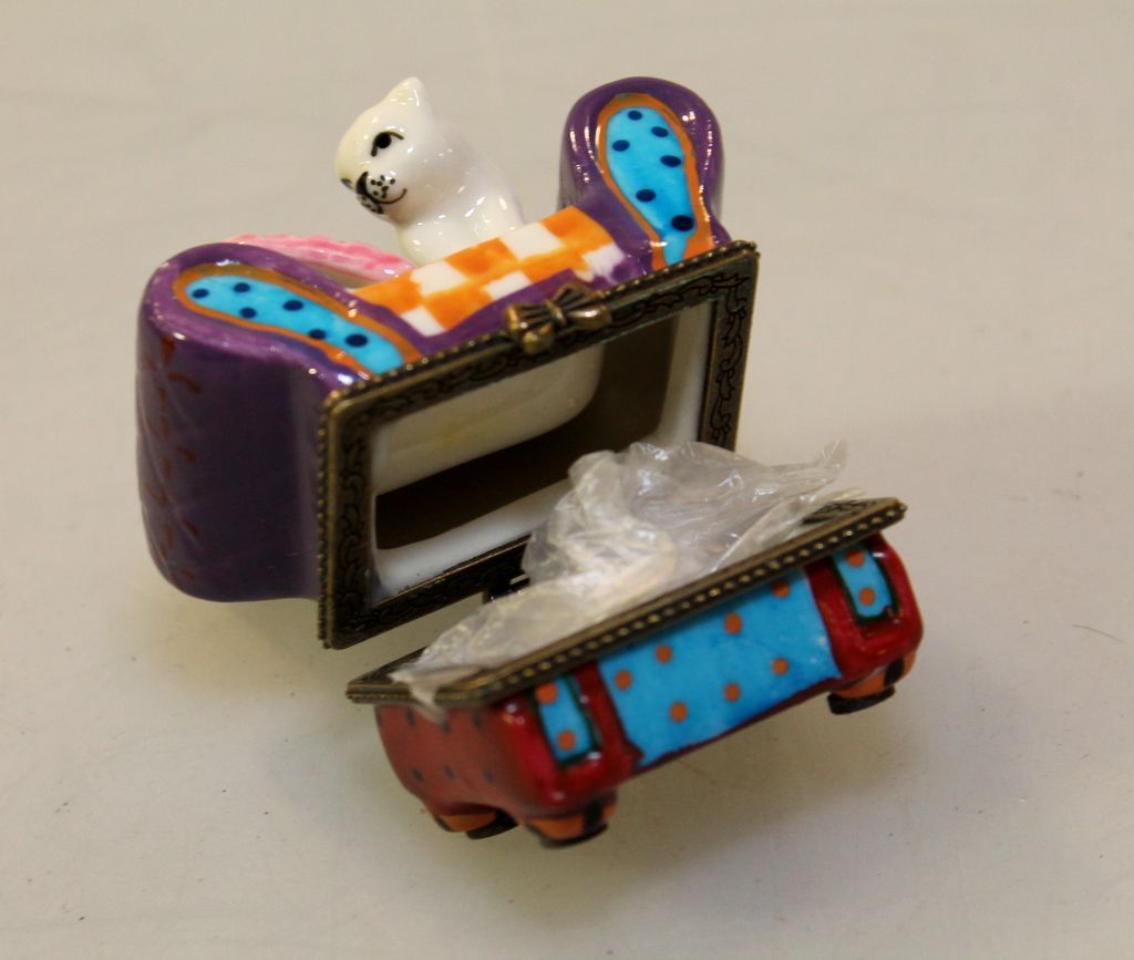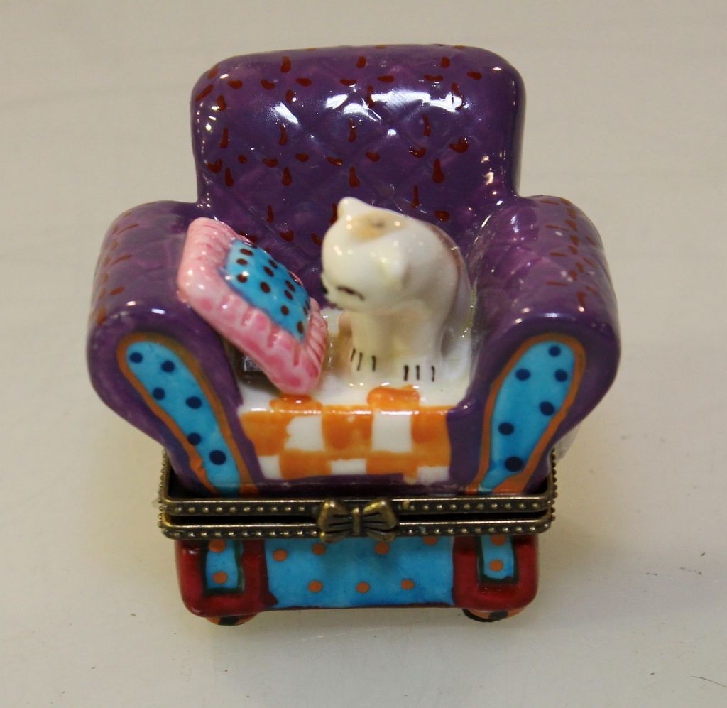 Small enamel box of cat in chair.; 2 1/2" w., 2" h. Small enamel box of cat in chair.; 2 1/2" w., 2" h.