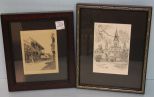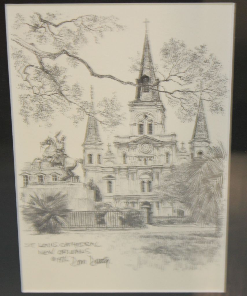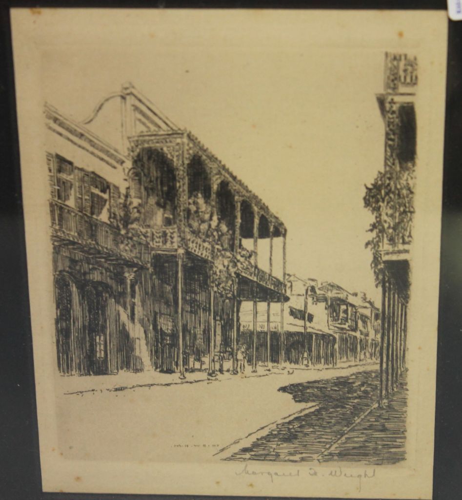 New Orleans French Quarter etchings signed Margaret H. Wright, 8 1/2" w., 9 1/2" h.; 1976 picture of St. Louis cathedral signed Dan Davey, 8 1/2" w., 10 1/2" h. New Orleans French Quarter etchings signed Margaret H. Wright, 8 1/2" w., 9 1/2" h.; 1976 picture of St. Louis cathedral signed Dan Davey, 8 1/2" w., 10 1/2" h.