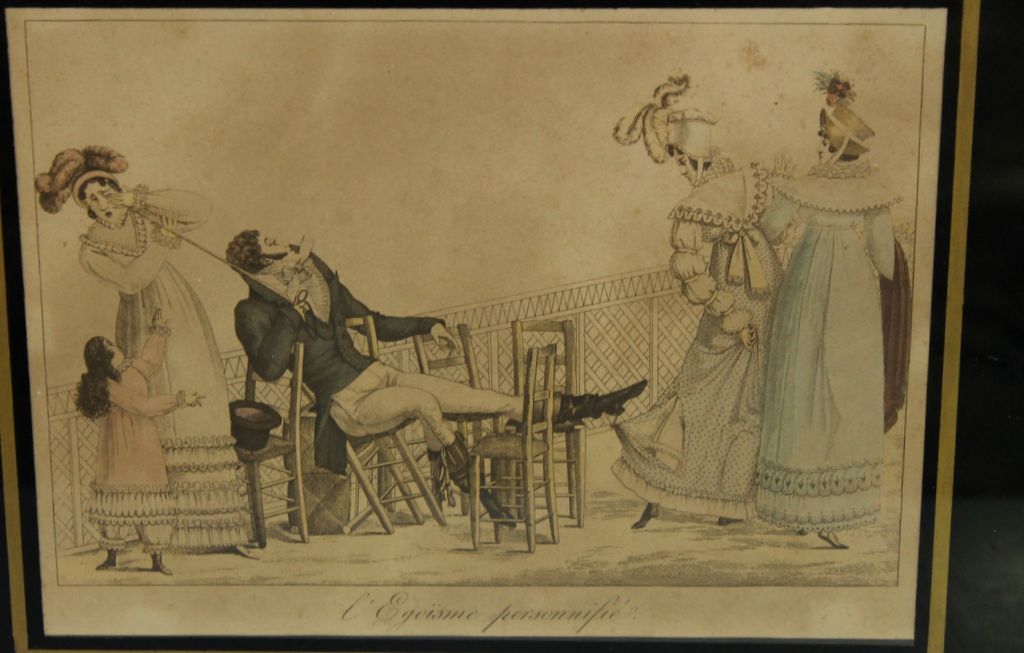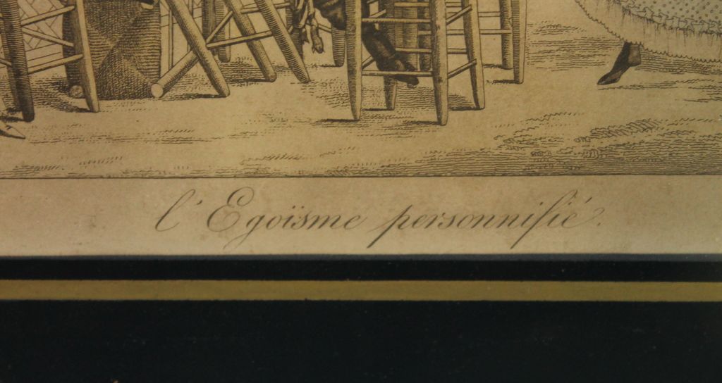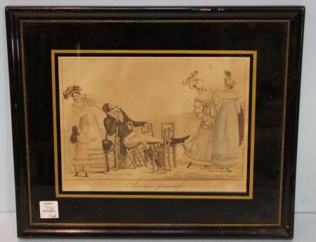 Whimsical French print in black frame.; 15" w., 12 1/2" h. Whimsical French print in black frame.; 15" w., 12 1/2" h.