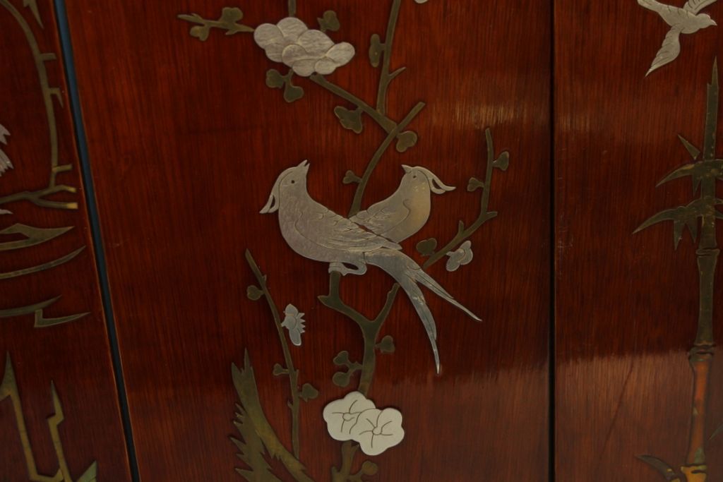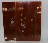 Mahogany high gloss plaques with silver and brass oriental motifs.; 8" w., 26" h. Mahogany high gloss plaques with silver and brass oriental motifs.; 8" w., 26" h.