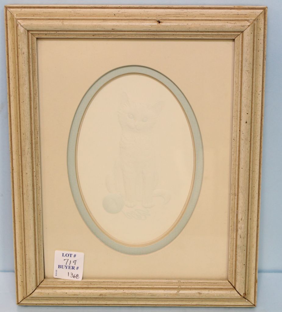 Embossed paper picture of cat. 8 1/2" w., 10" h. Embossed paper picture of cat. 8 1/2" w., 10" h.
