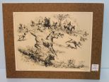 Etching of fox hunt by R.H. Palensla, Here We Go!, unframed.; 14" w., 11" h. Etching of fox hunt by R.H. Palensla, Here We Go!, unframed.; 14" w., 11" h.