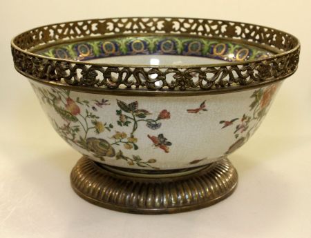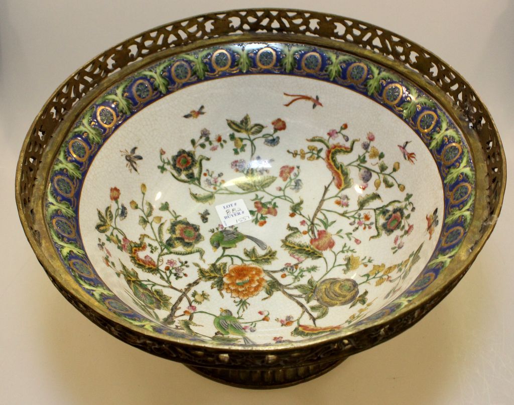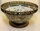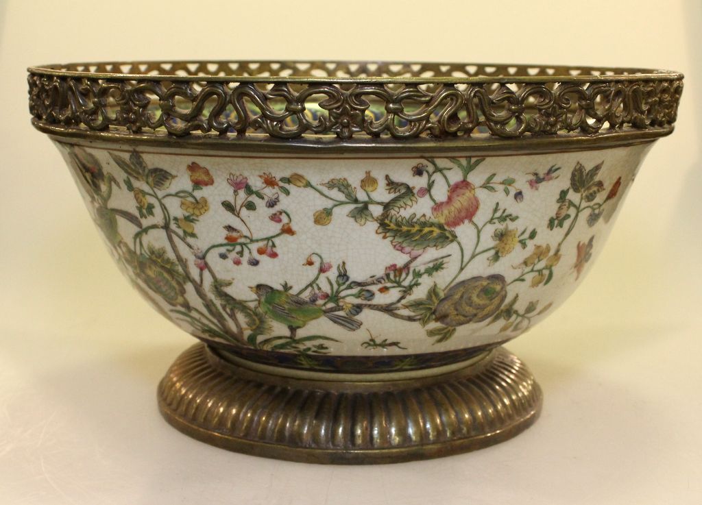 Large hand painted center bowl with bronze mounts.; 12 1/2" dia. Large hand painted center bowl with bronze mounts.; 12 1/2" dia.