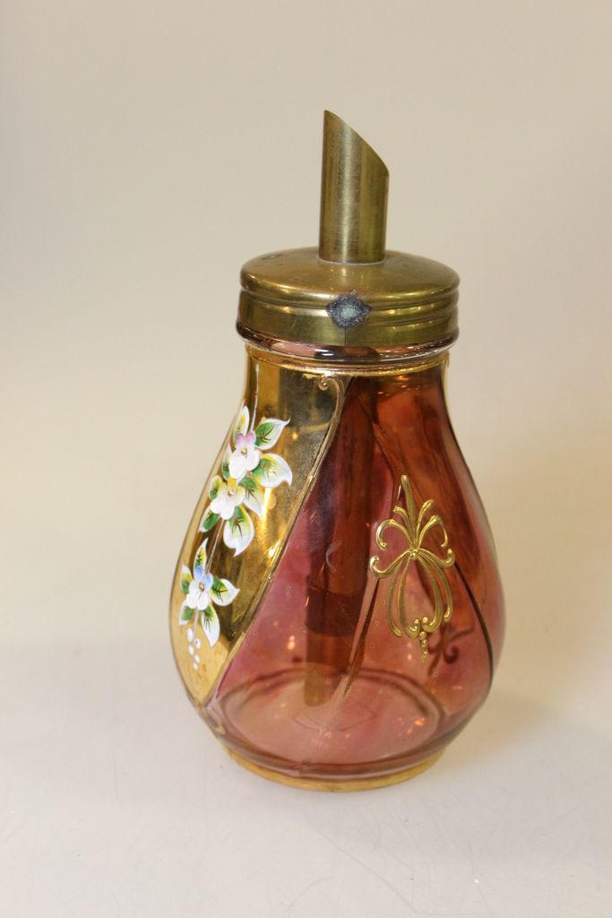 Pair of Mount Washington glass shakers and painted cranberry glass shaker. Pair of Mount Washington glass shakers and painted cranberry glass shaker.