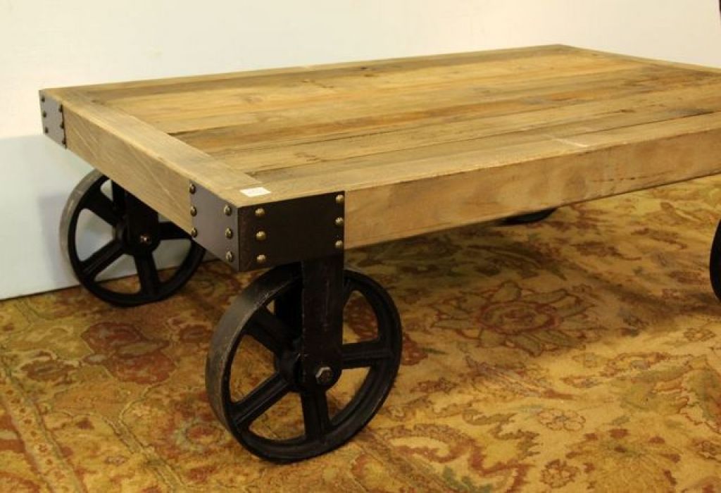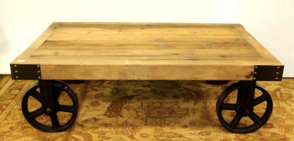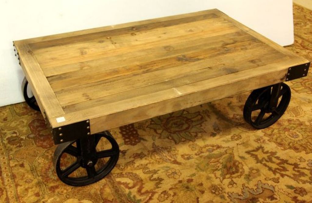Industrial wood and metal cart; 43" w., 14" h., 28" d. Industrial wood and metal cart; 43" w., 14" h., 28" d.