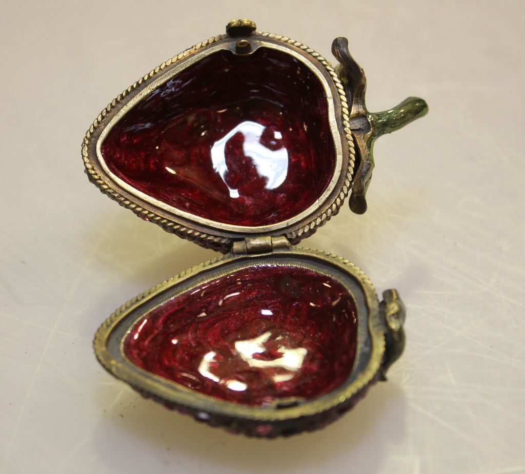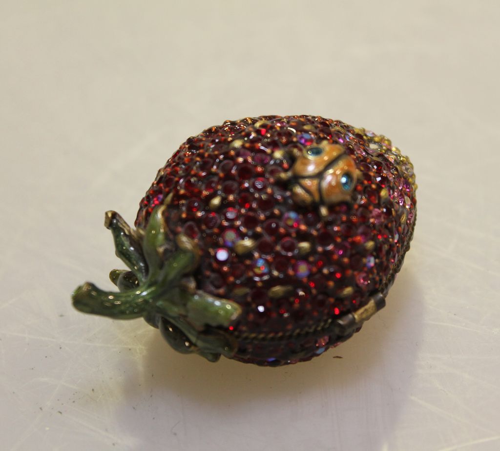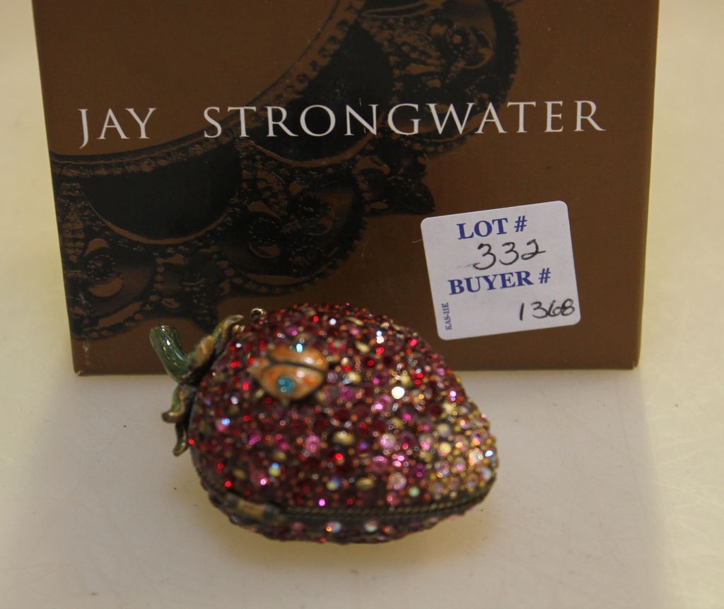 Jay Strongwater enamel box of strawberry with ladybug, in original box.; 2 1/2" w., 2 1/2" h. Jay Strongwater enamel box of strawberry with ladybug, in original box.; 2 1/2" w., 2 1/2" h.