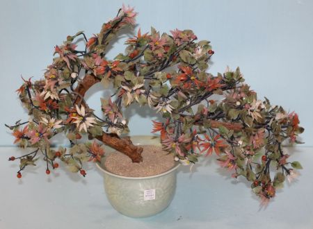 Chinese hand crafted stone tree constructed of white, lavender, and translucent spinach jade with agate and rose quartz, set in Celadon porcelain pot ; 30" w., 20" h. Chinese hand crafted stone tree constructed of white, lavender, and translucent spinach jade with agate and rose quartz, set in Celadon porcelain pot ; 30" w., 20" h.