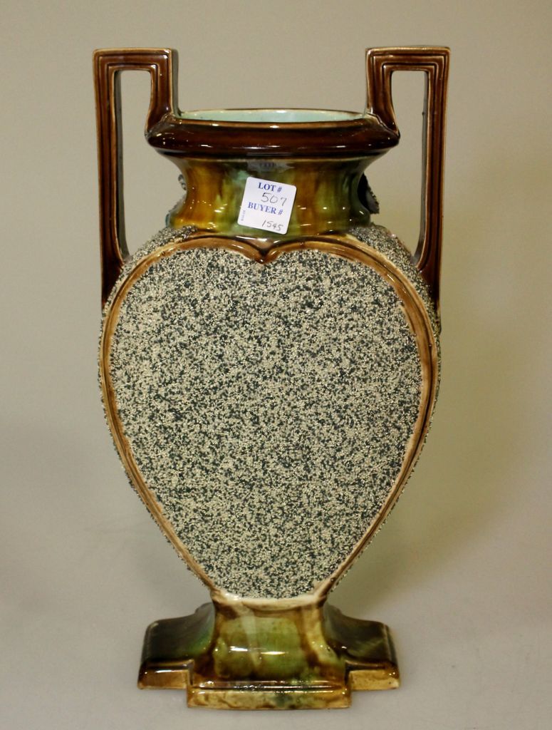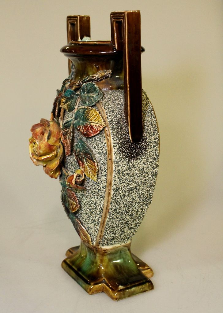 Pottery vase hand decorated with flowers on textured base (chip on leaf); 7 1/2" w., 14" h. Pottery vase hand decorated with flowers on textured base (chip on leaf); 7 1/2" w., 14" h.