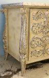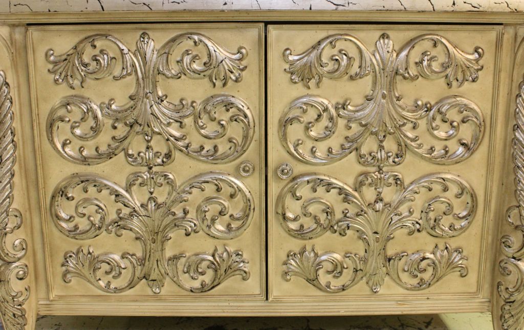 High style shabby chic commode, highlighted with carved silverleaf foliage.; 50" w., 24" d., 34" h. High style shabby chic commode, highlighted with carved silverleaf foliage.; 50" w., 24" d., 34" h.