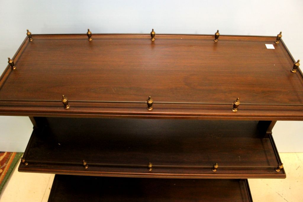 Three tier server with brass gallery, paw feet.; 35" w., 14" d., 37" h. Three tier server with brass gallery, paw feet.; 35" w., 14" d., 37" h.
