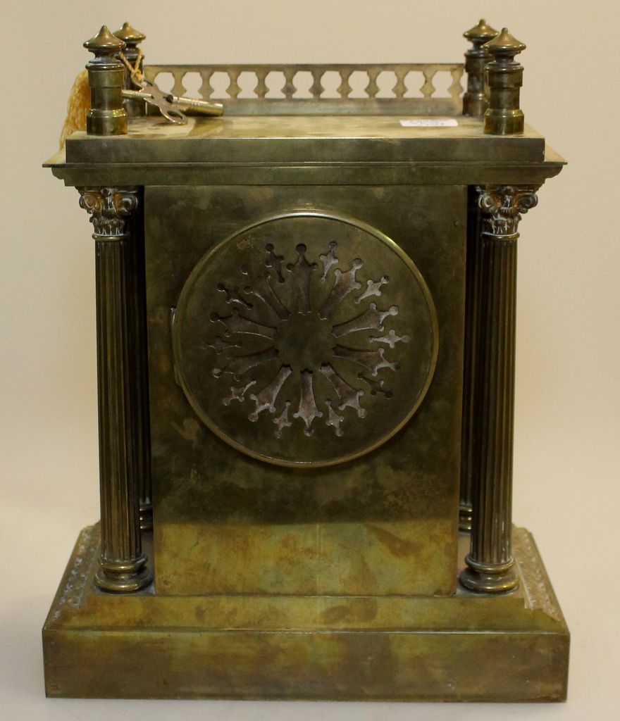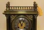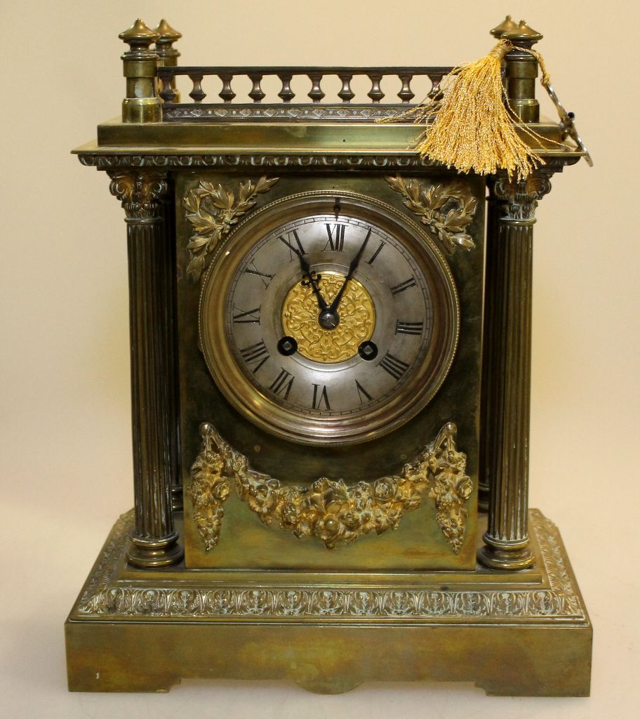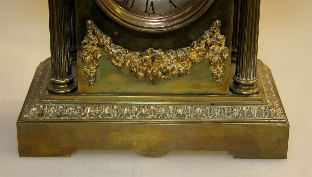 Highly decorated brass mantel clock with gallery and swag decor.; 9" w., 5" d., 12 1/2" h. Highly decorated brass mantel clock with gallery and swag decor.; 9" w., 5" d., 12 1/2" h.