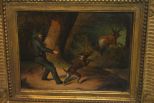 Finely done oil painting of hunter, dog and deer in original frame on tin, signature on back. Finely done oil painting of hunter, dog and deer in original frame on tin, signature on back.