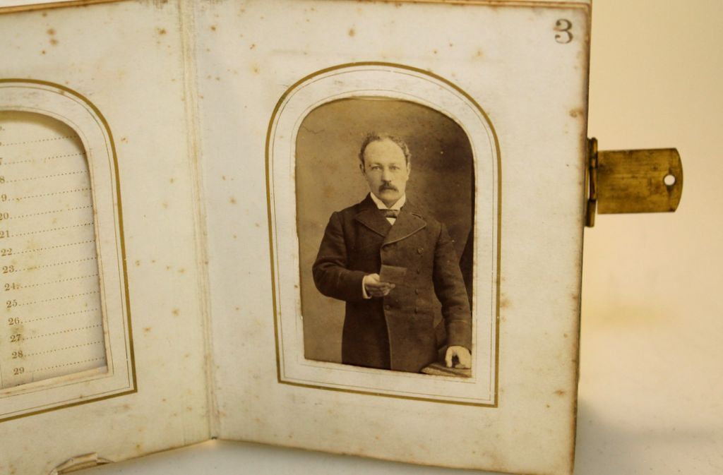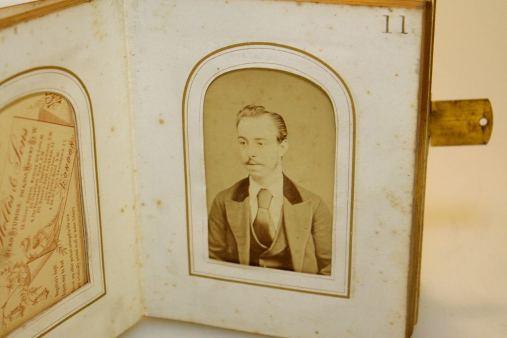 19th century antique mother of pearl photo album.; 4 1/2" w., 6" h. 19th century antique mother of pearl photo album.; 4 1/2" w., 6" h.