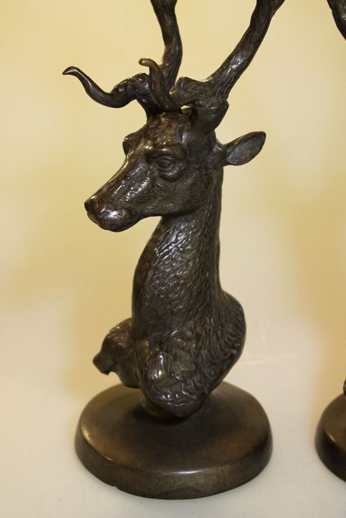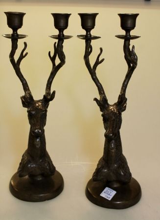 Pair of brass stag candle holders.; 5" dia., 15" h. Pair of brass stag candle holders.; 5" dia., 15" h.