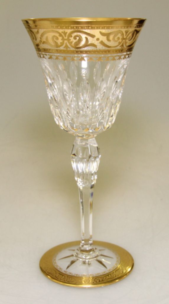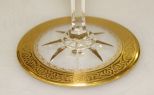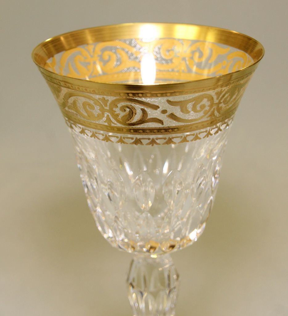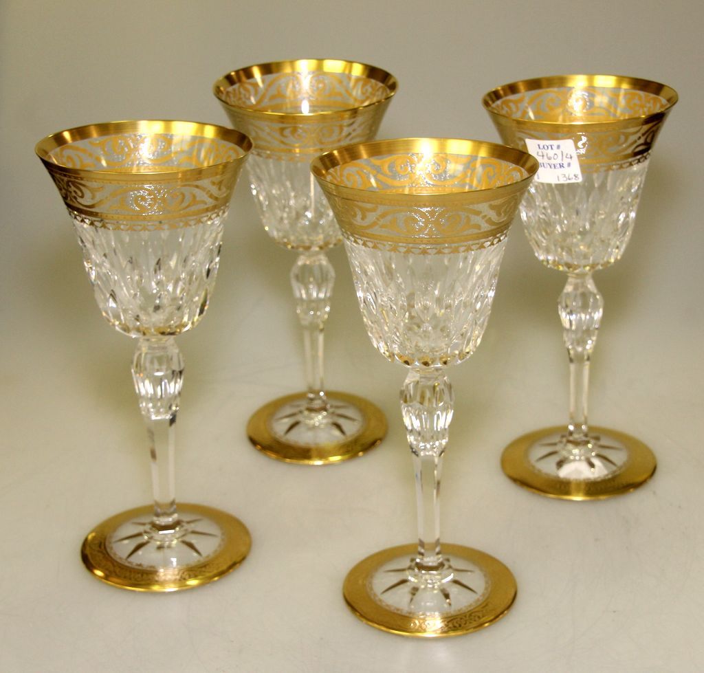 Set of Four signed Saint-Louis water goblets with gold trim, in original box.; 8 1/2" h. Set of Four signed Saint-Louis water goblets with gold trim, in original box.; 8 1/2" h.