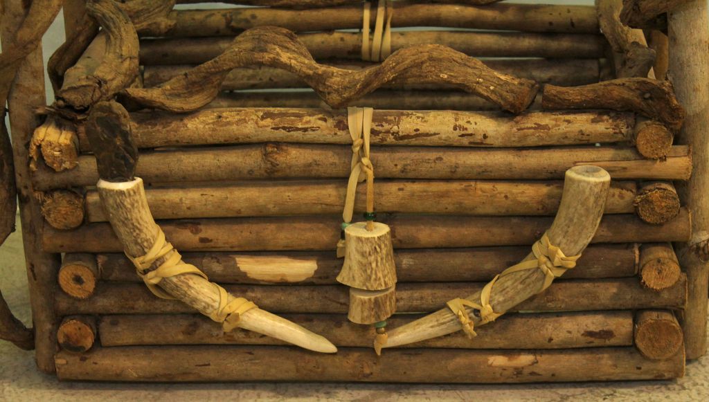 Large rectangular basket with deer antler handle and antler decoration.; 23" w., 13" d., 23" h. Large rectangular basket with deer antler handle and antler decoration.; 23" w., 13" d., 23" h.
