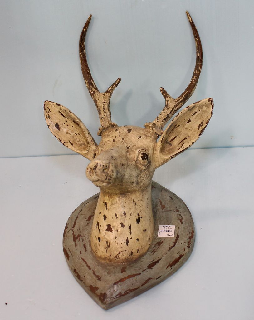 Shabby Chic painted wood carved deer head plaque.; 8" w., 17" h. Shabby Chic painted wood carved deer head plaque.; 8" w., 17" h.