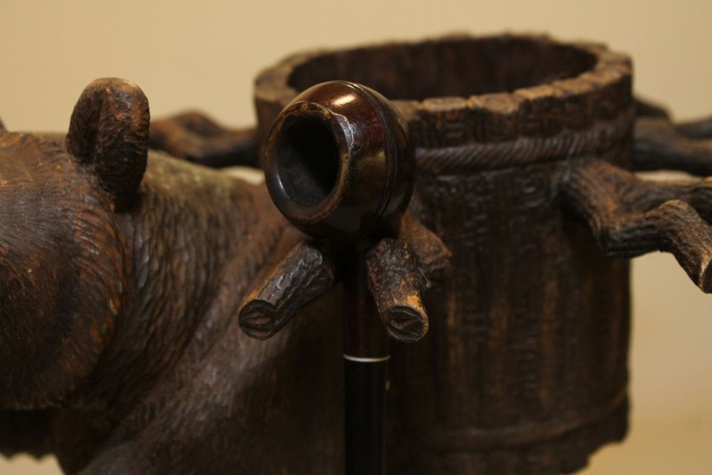 Carved bear holding stick carrying pot, possibly pipe holder or decanter set. Has one pipe.; 9" w., 10" h. Carved bear holding stick carrying pot, possibly pipe holder or decanter set. Has one pipe.; 9" w., 10" h.