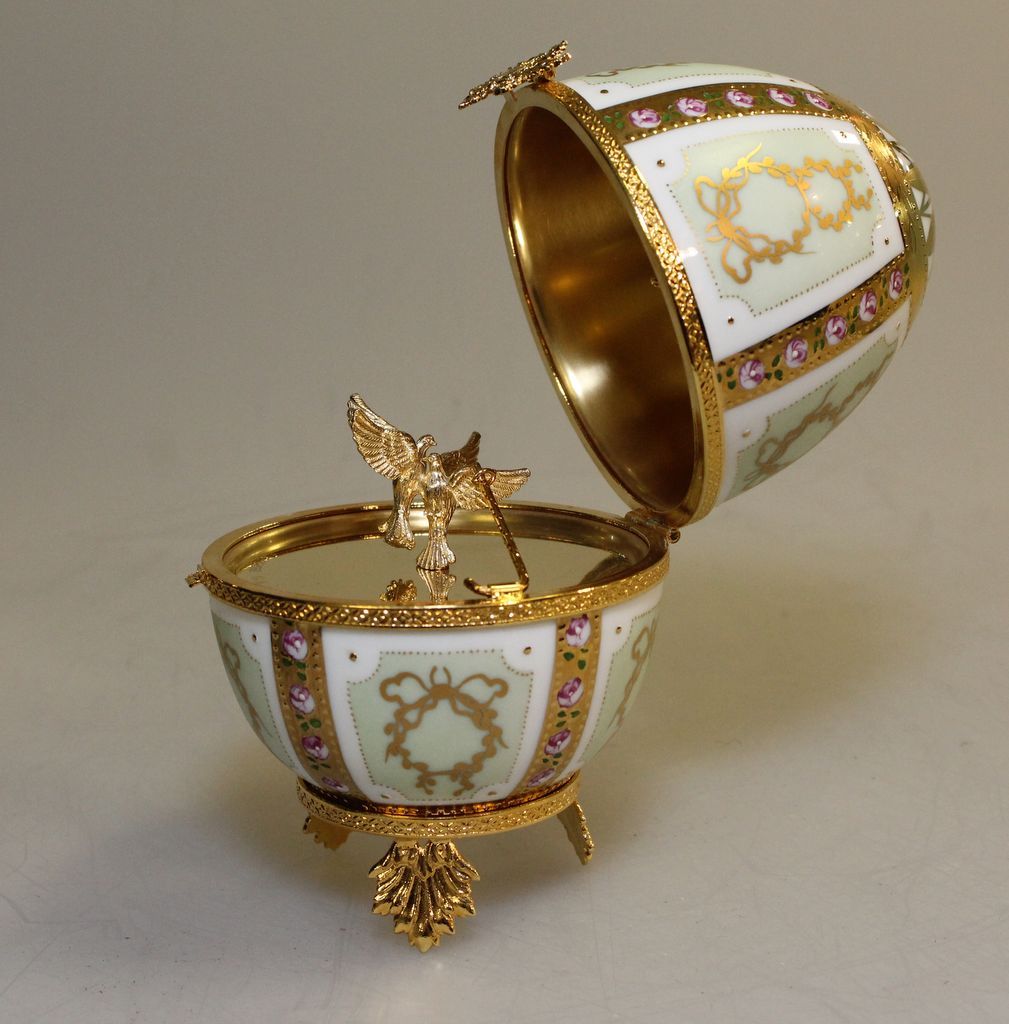 Limoge France gold enamel and jewel Faberge egg "Love Doves", #480, with original box.; 6" h. Limoge France gold enamel and jewel Faberge egg "Love Doves", #480, with original box.; 6" h.