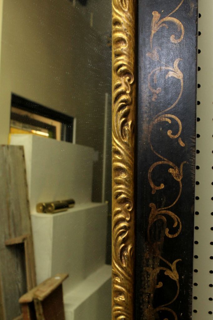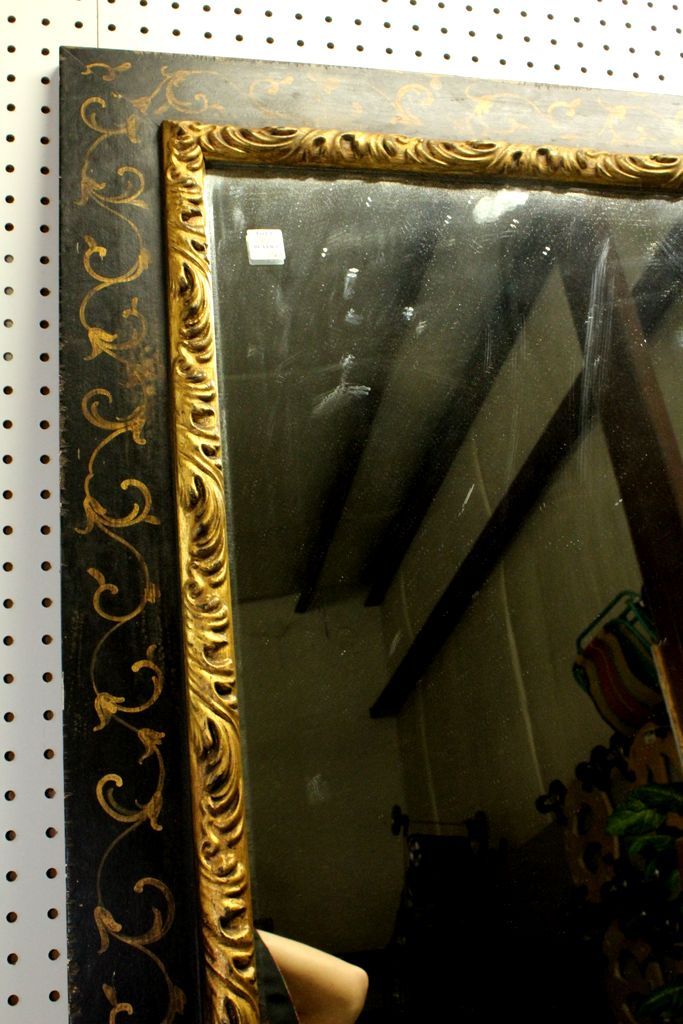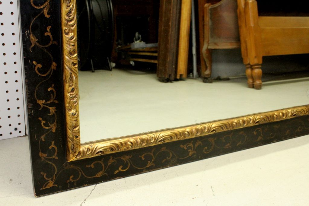 Huge decorative mirror with foliage painted on rim and gold gilt leafing.; 44 1/2" w., 87" h. Huge decorative mirror with foliage painted on rim and gold gilt leafing.; 44 1/2" w., 87" h.