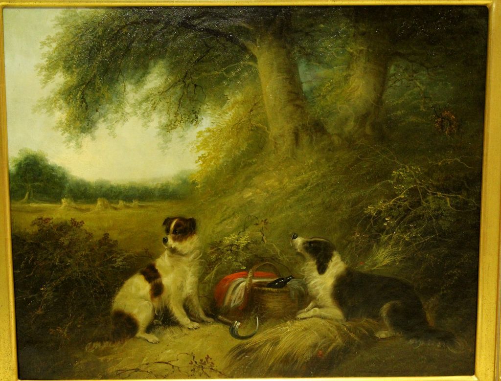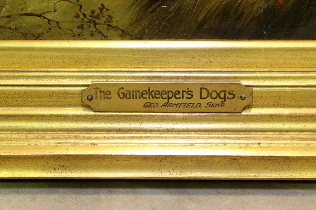 Oil on canvas entitled The Game Keeper's Dogs signed, lower left, George Armfield (British 1808-1893) has brass plaque.; 28 1/2" w., 24 1/2" h. Oil on canvas entitled The Game Keeper's Dogs signed, lower left, George Armfield (British 1808-1893) has brass plaque.; 28 1/2" w., 24 1/2" h.