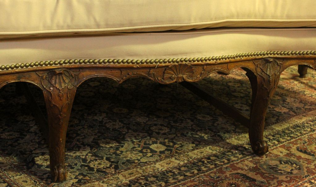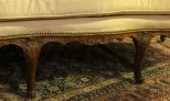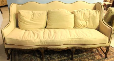 18th Century Regency Settee From Avignon accented with brass tacs, carved rococo legs, cushion and three pillows, covered in linen.; 82" w., 25" d., 40" h. 18th Century Regency Settee From Avignon accented with brass tacs, carved rococo legs, cushion and three pillows, covered in linen.; 82" w., 25" d., 40" h.