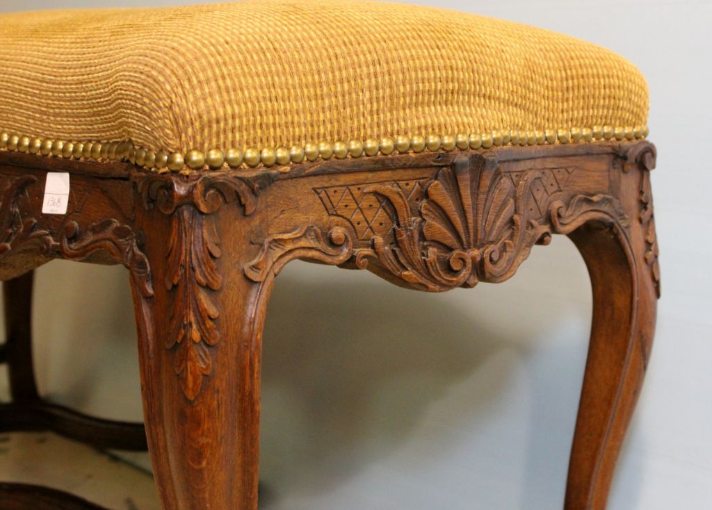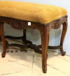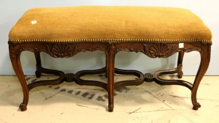 19th century finely carved walnut French Regency bench with shell carving and stretcher base.; 40" w., 17" d., 21" h. 19th century finely carved walnut French Regency bench with shell carving and stretcher base.; 40" w., 17" d., 21" h.