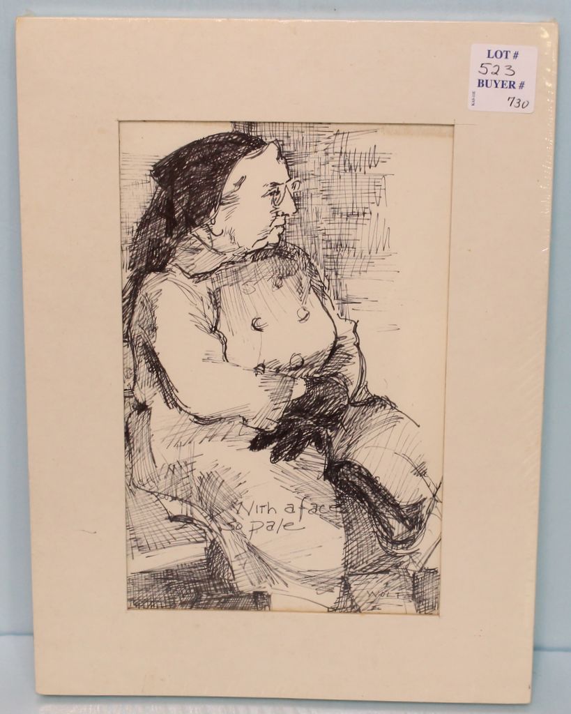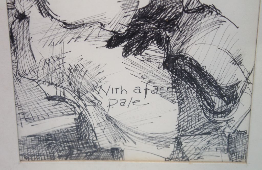 Pencil etching entitled with A Face So Pale, signed Wolfe (from Latimer Estate).; 8" w., 11" h. Pencil etching entitled with A Face So Pale, signed Wolfe (from Latimer Estate).; 8" w., 11" h.