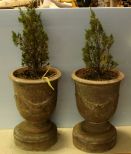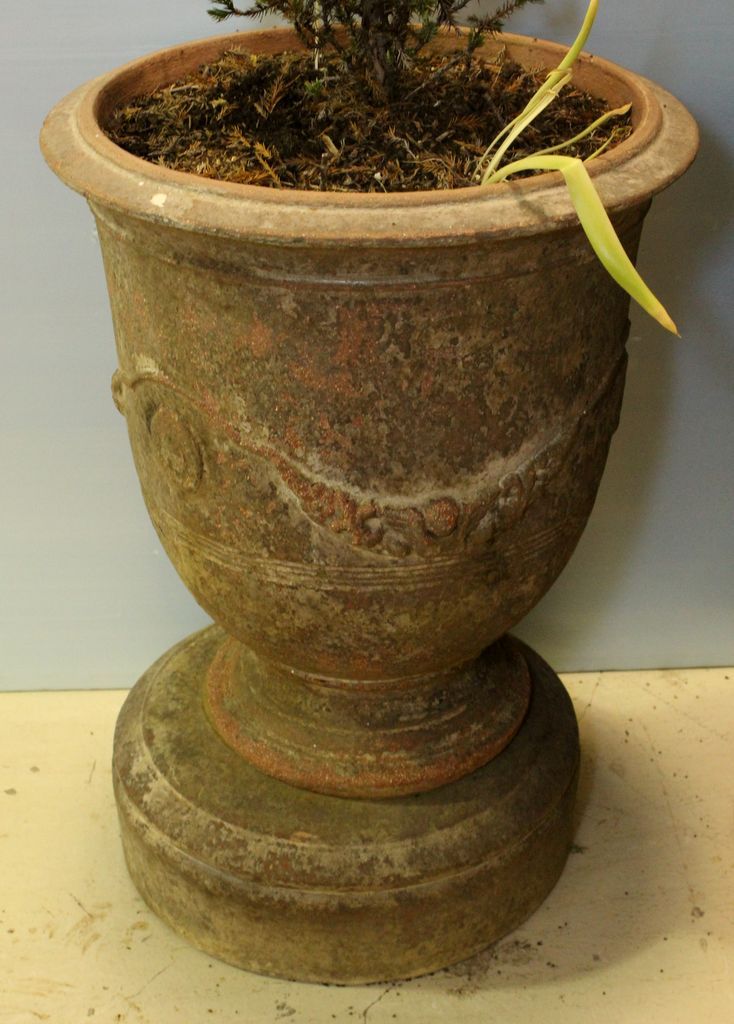 Pair of terracotta urn flower pots on round bases.; 18 1/2" dia., 27" h. Pair of terracotta urn flower pots on round bases.; 18 1/2" dia., 27" h.