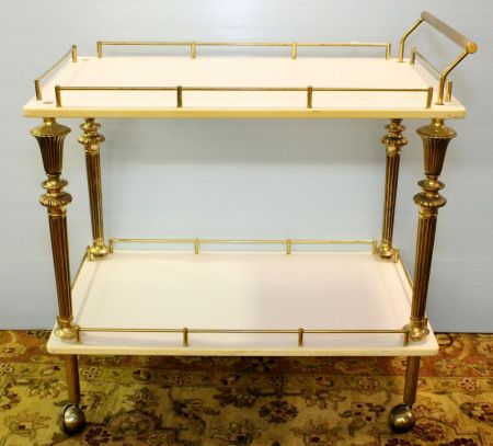 Decorative laminate cart with brass columns and gallery.; 31" w., 17 1/2" d., 31" h. Decorative laminate cart with brass columns and gallery.; 31" w., 17 1/2" d., 31" h.