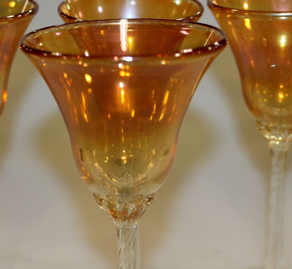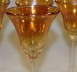 Four art merigold to clear goblets, signed on bottom. 9" h. Four art merigold to clear goblets, signed on bottom. 9" h.