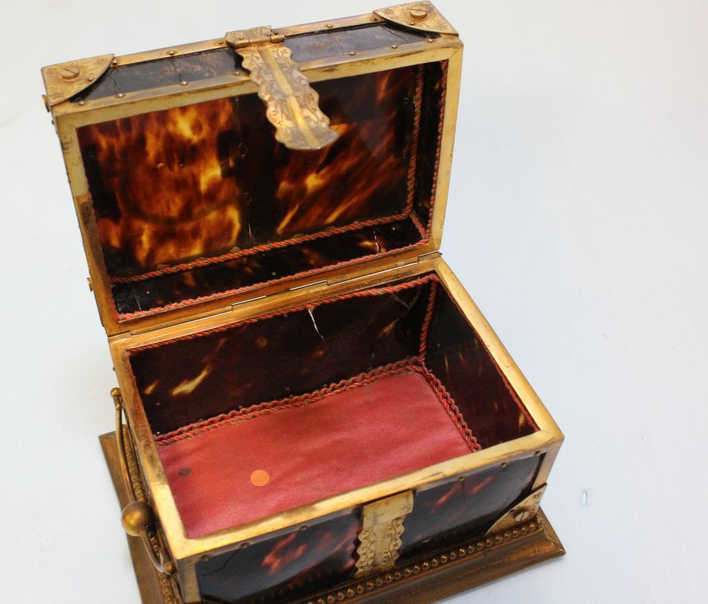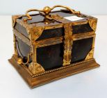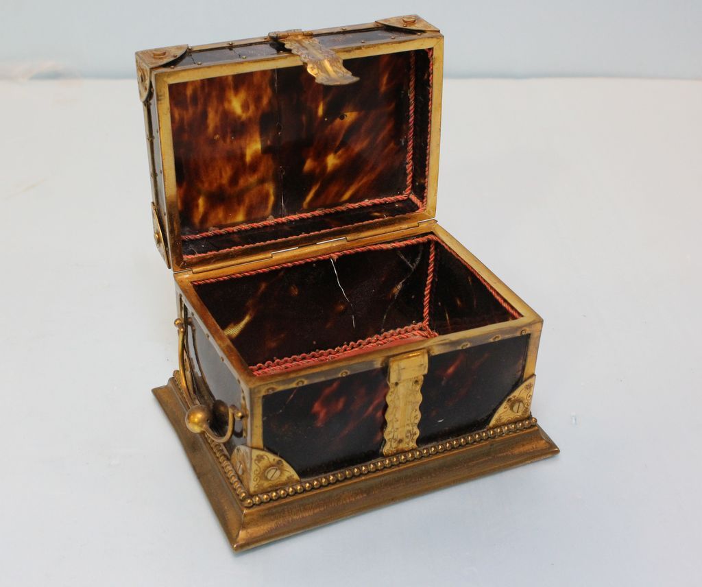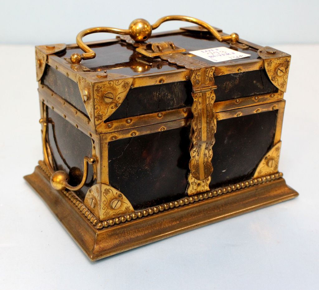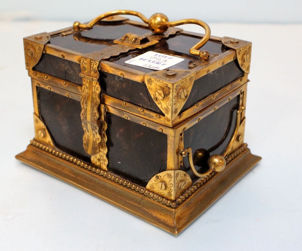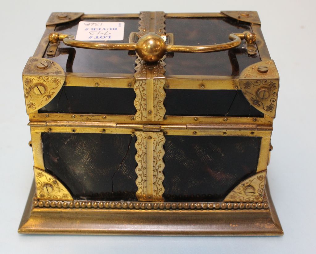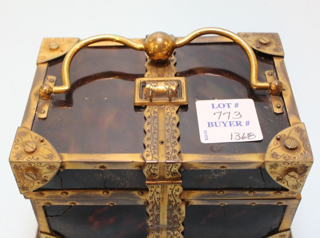 Tortoise shell treasure box with brass straps and handle.; 5 1/2" w., 4" d., 3 1/2" h. Tortoise shell treasure box with brass straps and handle.; 5 1/2" w., 4" d., 3 1/2" h.