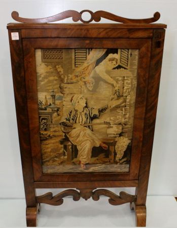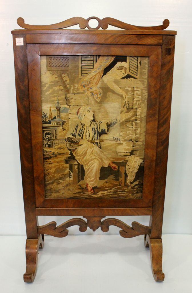 Empire mahogany firescreen with needlepoint.; 23" w., 40" h. Empire mahogany firescreen with needlepoint.; 23" w., 40" h.