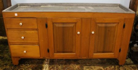 19th century pine dry sink with tin top working area, porcelain knobs. Cabinet has three drawers and two doors.; 58 1/2" w., 19" d., 30" h. 19th century pine dry sink with tin top working area, porcelain knobs. Cabinet has three drawers and two doors.; 58 1/2" w., 19" d., 30" h.