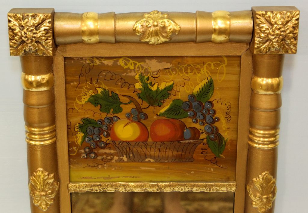 Empire gilt mirror with reverse painted basket of fruit.; 15" w., 29" h. Empire gilt mirror with reverse painted basket of fruit.; 15" w., 29" h.