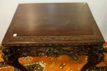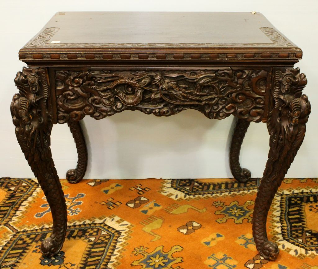19th century heavily carved side table with dragons and other oriental motif, rococo legs.; 33" w., 29" d., 30" h. 19th century heavily carved side table with dragons and other oriental motif, rococo legs.; 33" w., 29" d., 30" h.