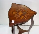 Edwardian shield shape pedestal with floral inlay top and brass banding.; 13" w., 33" h. Edwardian shield shape pedestal with floral inlay top and brass banding.; 13" w., 33" h.