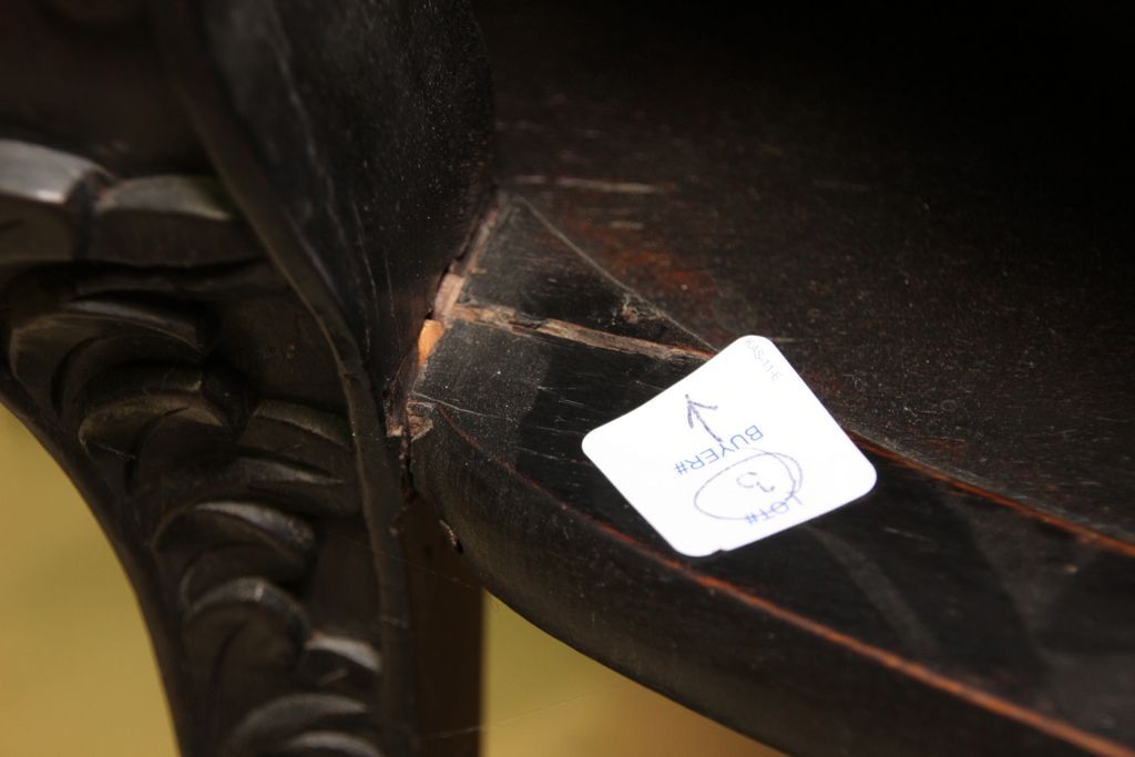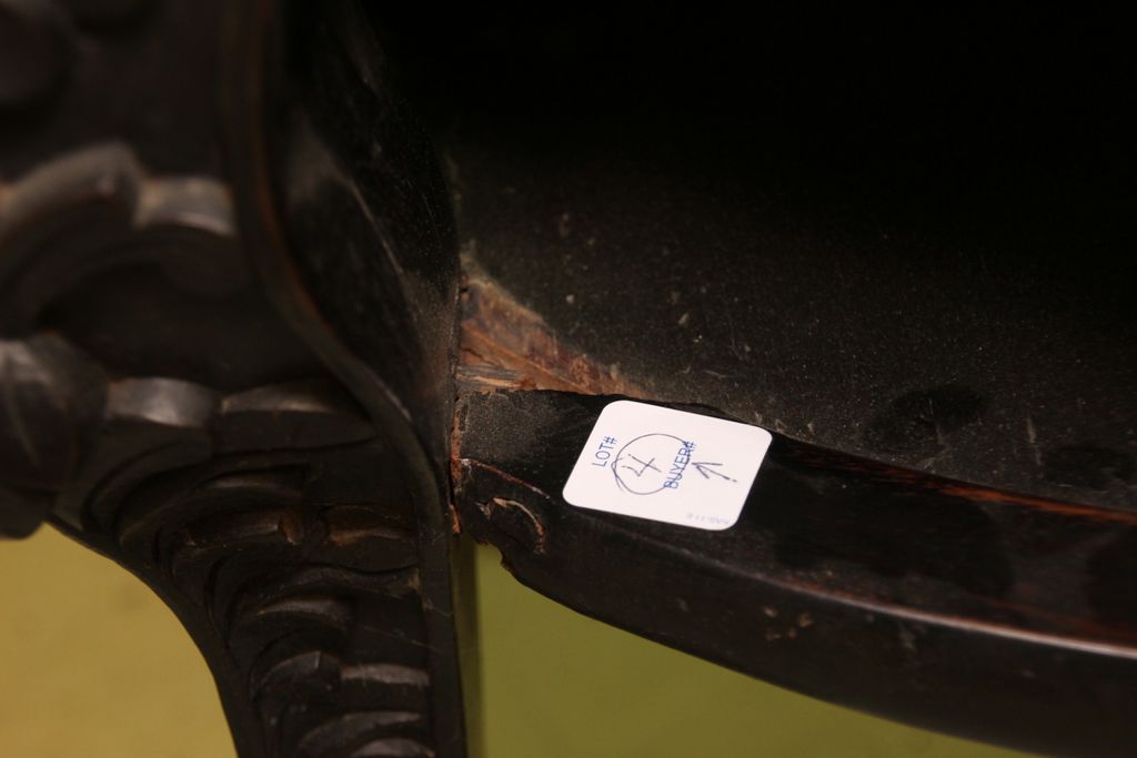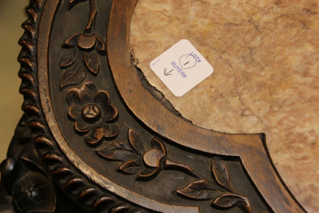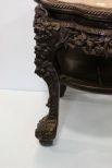 Heavily carved oriental marble top end table. Top has scalloped design marble inset into carved flowers on apron and legs.; 22" dia., 22" h. Heavily carved oriental marble top end table. Top has scalloped design marble inset into carved flowers on apron and legs.; 22" dia., 22" h.