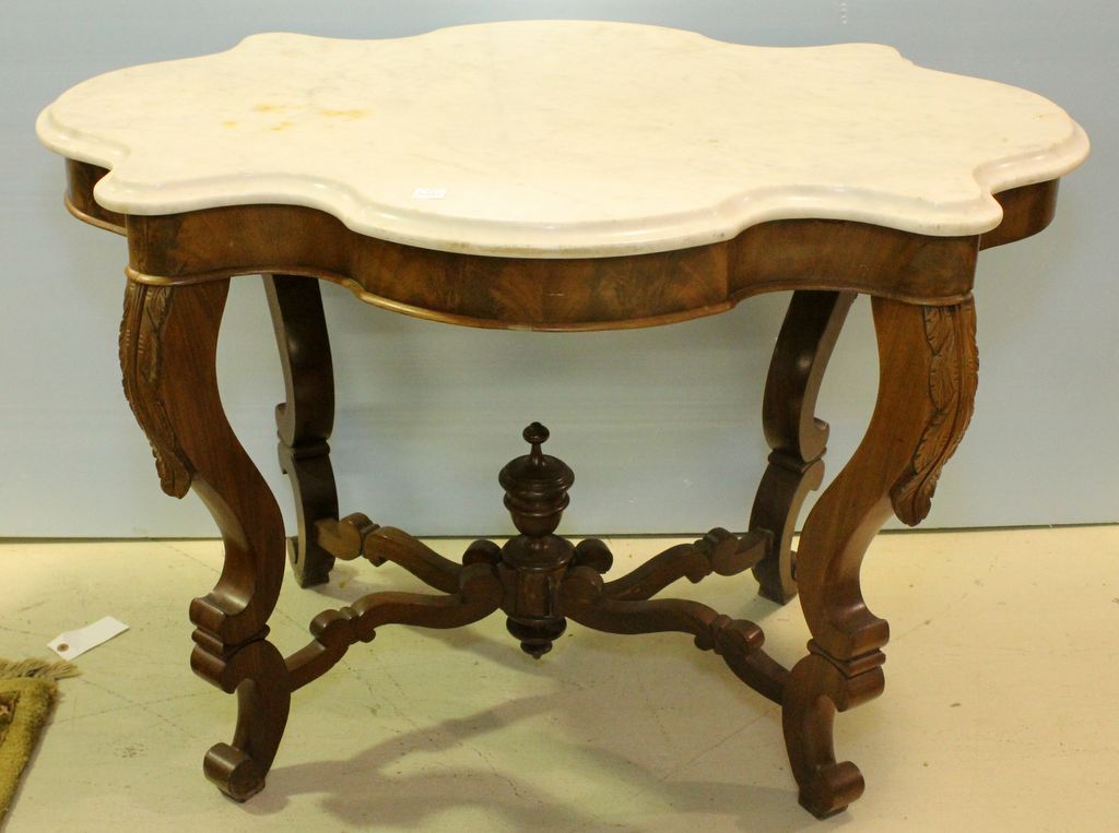 Mid 1860s mahogany Victorian marble turtle top table with stretchers going into center urn.; 39" w., 29" d., 29" h. Mid 1860s mahogany Victorian marble turtle top table with stretchers going into center urn.; 39" w., 29" d., 29" h.