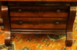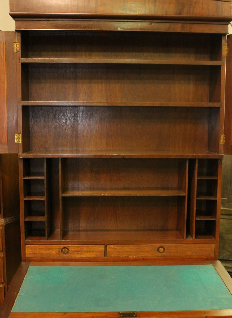 19th century empire mahogany two section secretary. The top section having two doors over fall front section with fitted interior, lower section has three drawers and S curved legs.; 40 1/2" w., 18 1/2" d., 84" h. 19th century empire mahogany two section secretary. The top section having two doors over fall front section with fitted interior, lower section has three drawers and S curved legs.; 40 1/2" w., 18 1/2" d., 84" h.