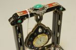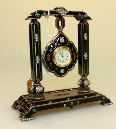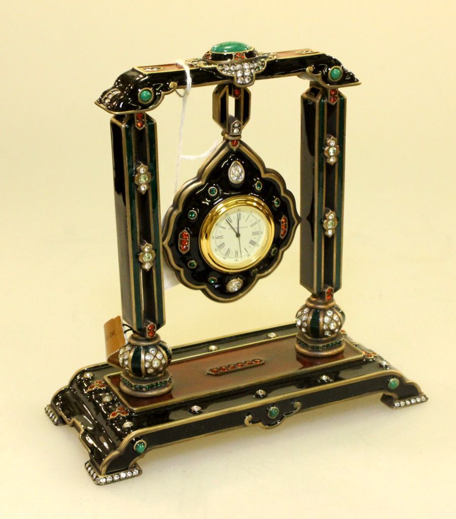 Jay Strongwater hanging pendant clock, deco color, decorated with swarvorski crystals and stones, with box.; 7" h. Jay Strongwater hanging pendant clock, deco color, decorated with swarvorski crystals and stones, with box.; 7" h.