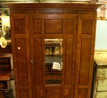 High style English oak pegged single door armoire with divided panel front with beveled glass door, shelf interior and bottom drawer.; 47 1/2" w., 18" d., 80 1/2" h. High style English oak pegged single door armoire with divided panel front with beveled glass door, shelf interior and bottom drawer.; 47 1/2" w., 18" d., 80 1/2" h.