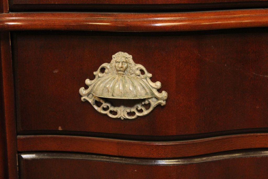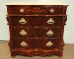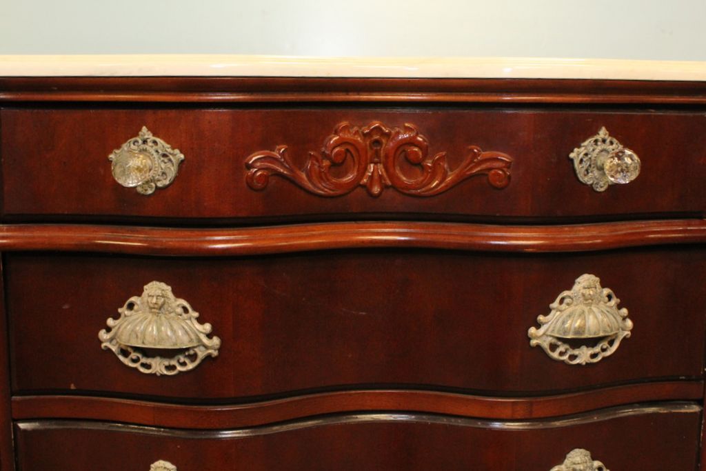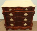 Pulaski marble top four drawer bedside table with two faceted glass pulls, S curve to drawers, cookie corner marble top. 32" w., 20" d., 21" h. Pulaski marble top four drawer bedside table with two faceted glass pulls, S curve to drawers, cookie corner marble top. 32" w., 20" d., 21" h.