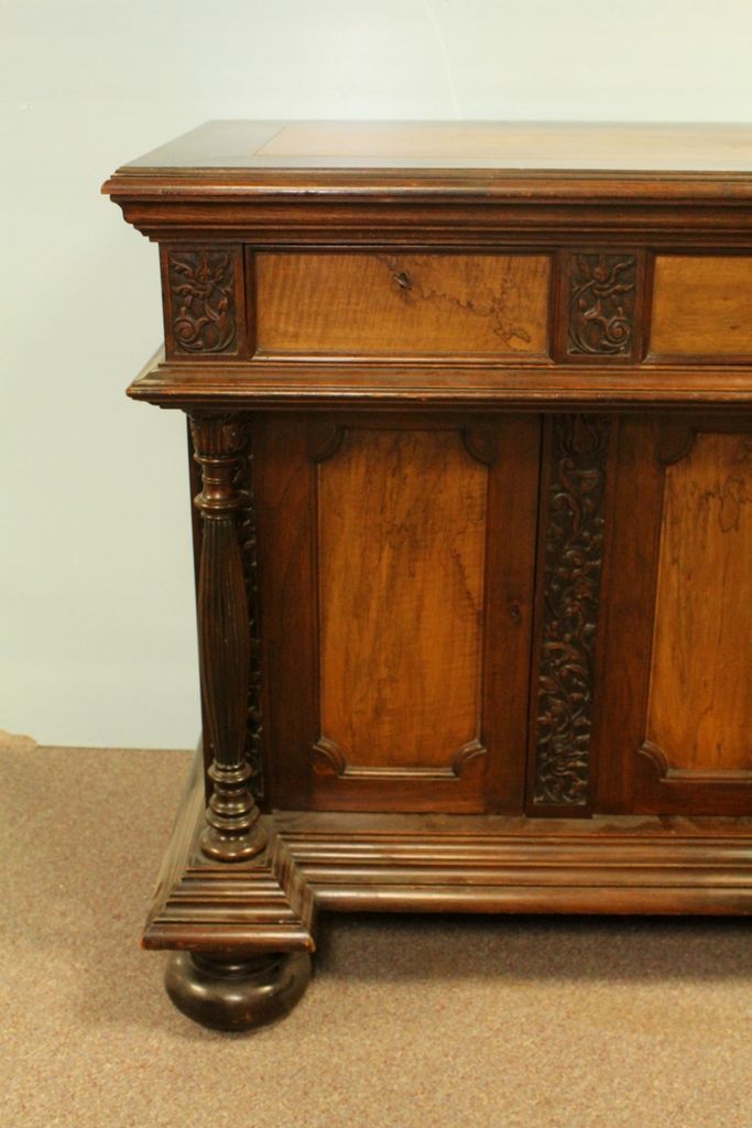 19th century English sideboard with carved and burl drawers and doors, reeded columns all supported by bun feet.; 65 1/2" w., 25" d., 40" h. 19th century English sideboard with carved and burl drawers and doors, reeded columns all supported by bun feet.; 65 1/2" w., 25" d., 40" h.